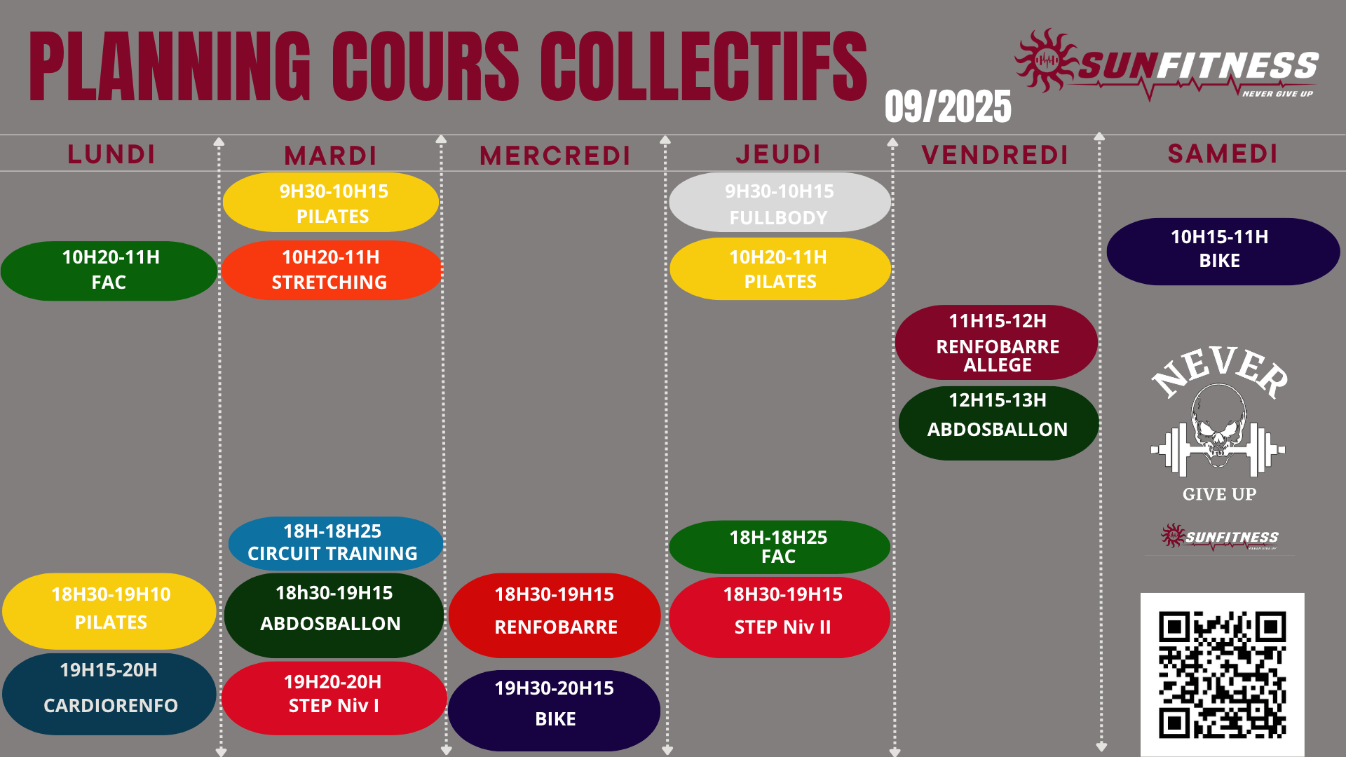 Les cours collectifs SUNFITNESS sont conçus et donnés par des coachs qualifiés. Nos entraîneurs s’assurent que les exercices sont bien exécutés ; ils créent une bonne ambiance, vous motivent et vous assistent. L’exaltation du groupe vous poussera à vous dépasser et à ne rien lâcher.